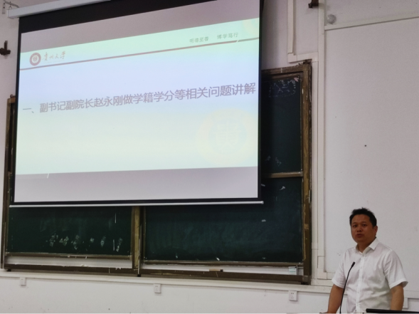 赵永刚对学籍学分等相关问题进行讲解。他指出2020级本科生即将步入大四,要对学分问题高度重视,严格按照专业培养方案选修课程,认真检查、仔细核对各板块已修学分,并主动与学院沟通,做到查缺补漏,及时解决。其次,他强调同学们一定要坚守底线原则,严禁参与赌博行为,保持良好学风。