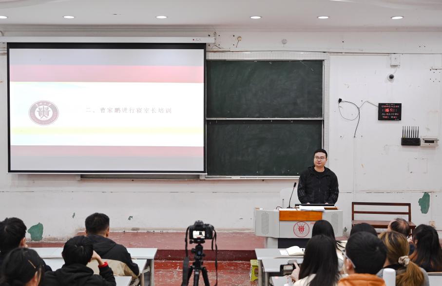 曹家鹏对寝室长进行培训。他从寝室长的角色定位、要具备的思想品质、应履行的职责进行了讲解,并对寝室长工作提出要求:一是发挥模范带头作用,要加强自身思想道德建设,提高责任意识,关心关爱寝室成员情况,做好寝室管理和安全隐患排查工作,维护寝室安定团结和谐。二是发挥桥梁纽带作用,认真落实学校学院管理制度,促进“三长制”层层联动,共同建设文明寝室。