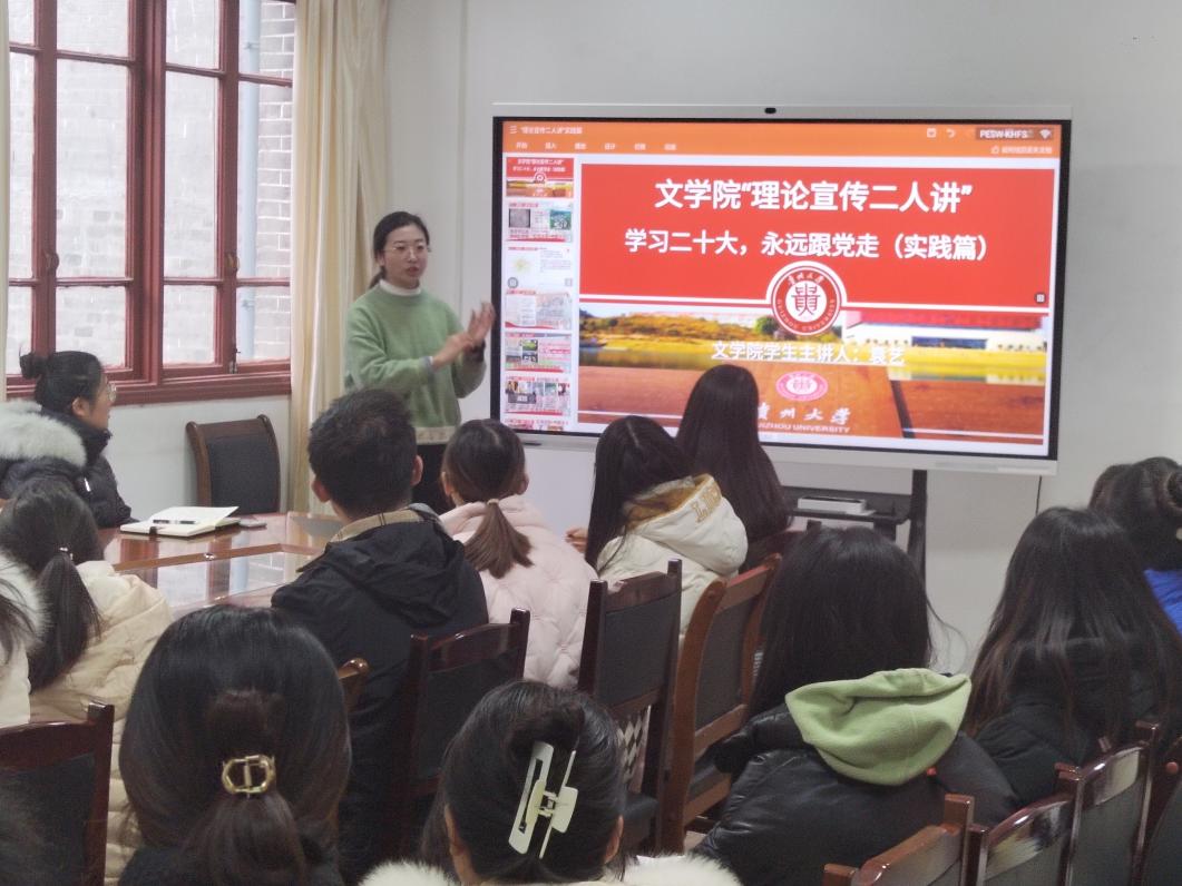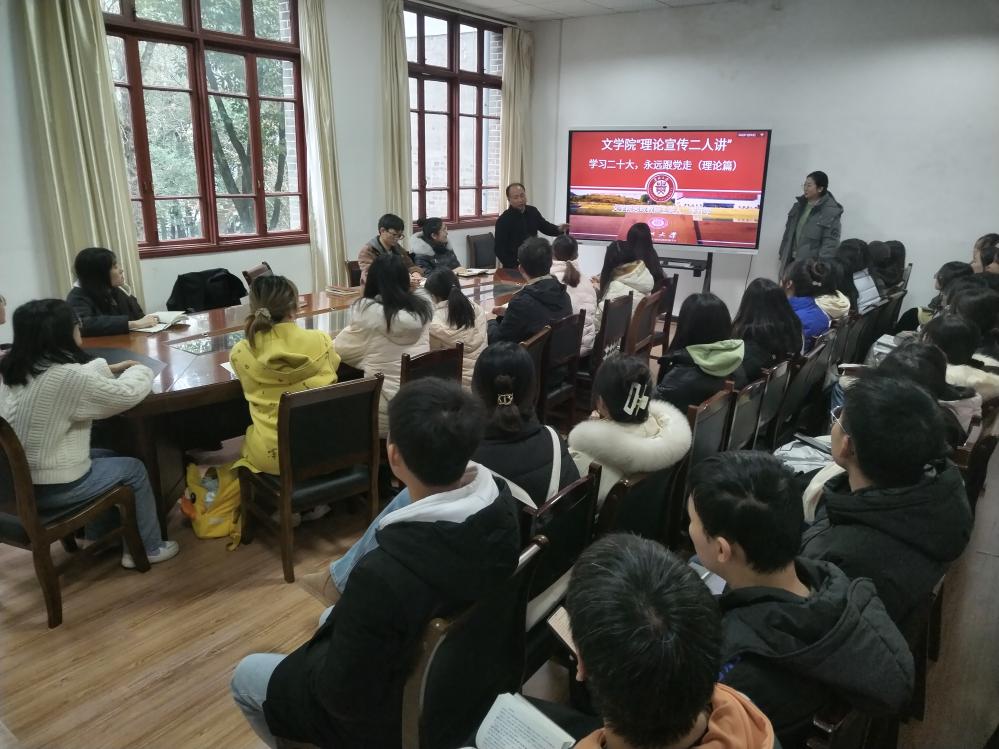 根据校党委202398日印发的《关于在全校开展新时代党的创新理论“理论宣传二人讲”宣讲的通知》,为促进我院学子深入了解新时代党的创新理论,文学院思政课教师主讲人李开学和学生主讲人袁艺于20231221日在人文楼204会议室,面向汉语2101班全体同学进行理论宣讲。