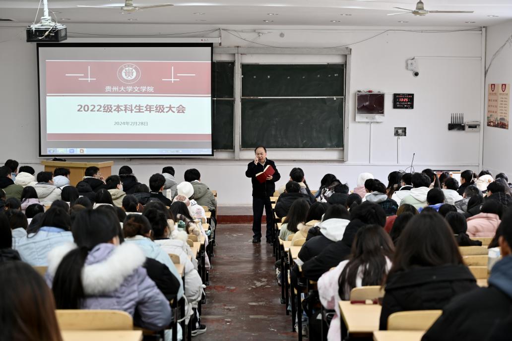 2023年2月28日中午,贵州大学文学院在逸夫楼515DT召开2022级本科生新学期年级大会。学院党委书记李开学、本科生思政辅导员曹家鹏及全体2022级本科生参加会议。会议由曹家鹏主持。