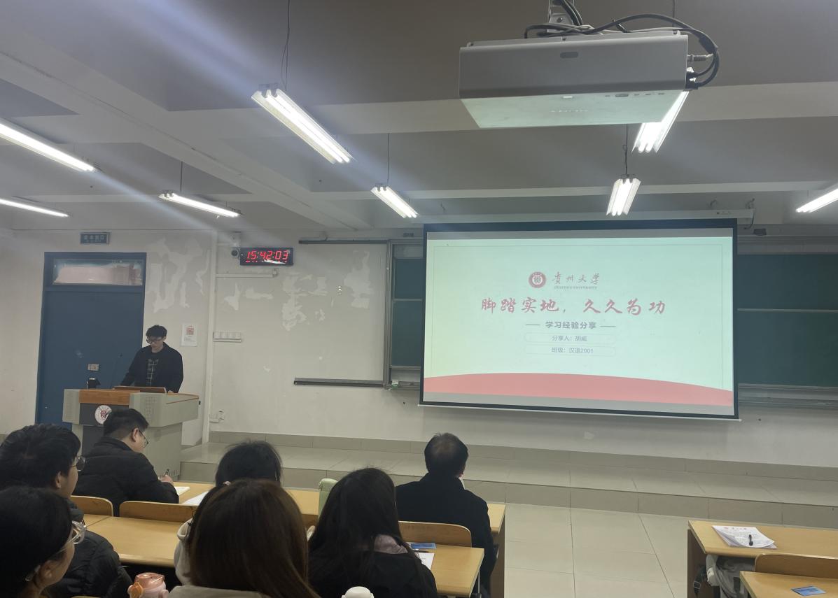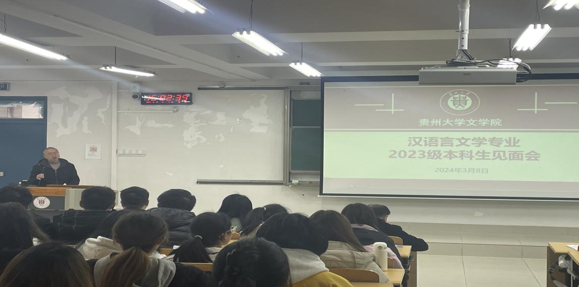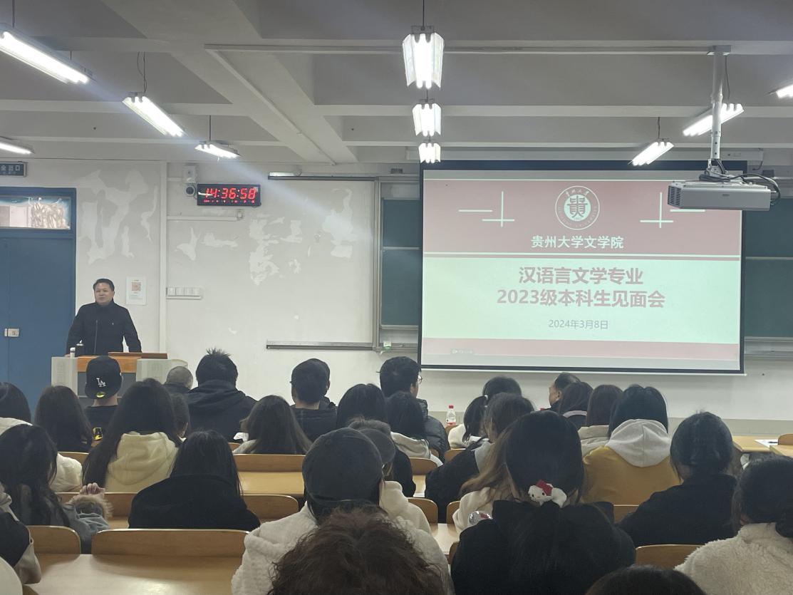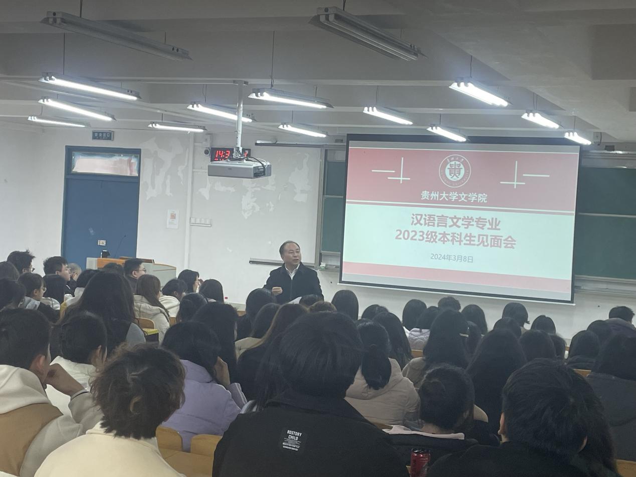 202438下午贵州大学文学院在南校区致知楼102DT召开2023级本科生见面会,学院党委书记李开学、副书记院长谭德兴、副书记副院长赵永刚、本科生思政辅导员罗兰、曹家鹏及全体2023级本科生参加本次会议。会议由李开学主持。