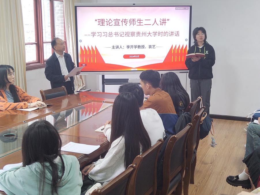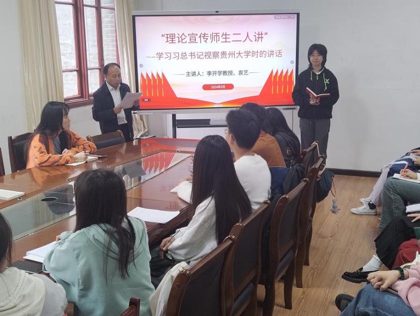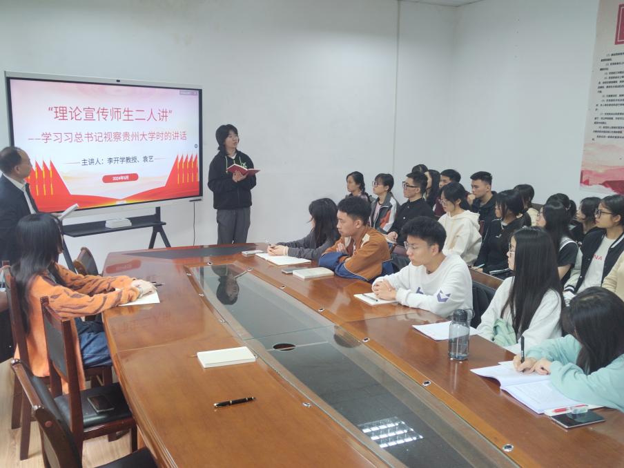为引导我院学子坚定理想信念,牢记习近平总书记嘱托,2024年5月16日,我院在人文楼204会议室开展了“理论宣传师生二人讲”活动,重温习近平总书记对贵大师生的寄语,深入学习贯彻习近平总书记视察贵州大学重要讲话精神。院党委书记李开学和院学生会主席袁艺分别担任思政课教师主讲人和学生主讲人进行理论宣传,汉语2101班全体同学参与学习。