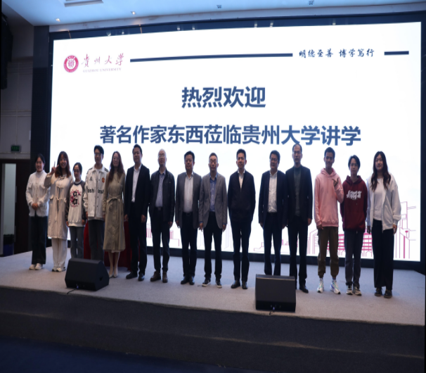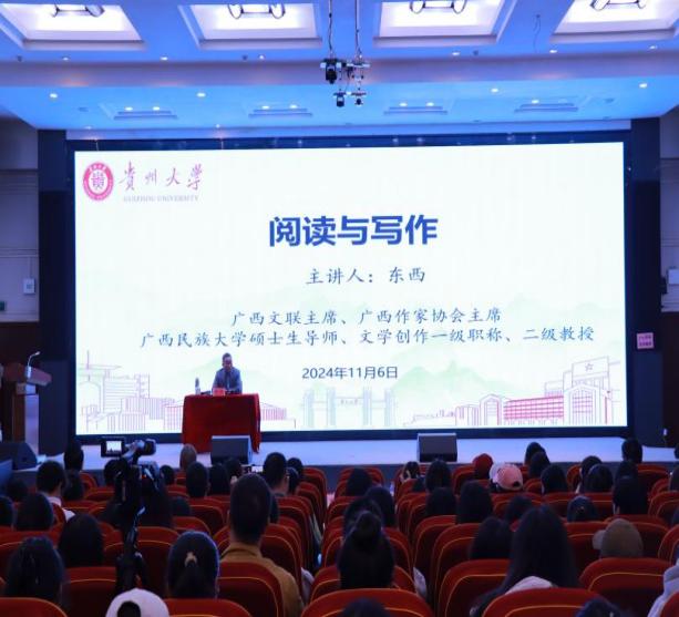 2024年11月6日,贵州大学“溪山论道·文科讲坛”2024年第59期在贵州大学东校区行政楼报告厅圆满举行。本次讲坛以中国作协、贵州省委宣传部指导,中国作协创联部、贵州省作协主办的“全国文学名家走进贵州创作实践活动”为主题,由贵州大学人文社科处、贵州大学文学院承办,邀请广西作家协会主席、鲁迅文学奖获得者、茅盾文学奖获得者、著名作家东西先生主讲。贵州大学党委常委、副校长陈祥盛,贵州省作协党组成员、副主席高宏,贵州大学文学院党委书记陈爱东,贵州大学文学院院长谭德兴,贵州大学文学院副书记、副院长赵永刚,以及师生300余人参加本次讲座。讲座由贵州大学文学院院长谭德兴主持,贵州大学党委常委、副校长陈祥盛致欢迎辞。