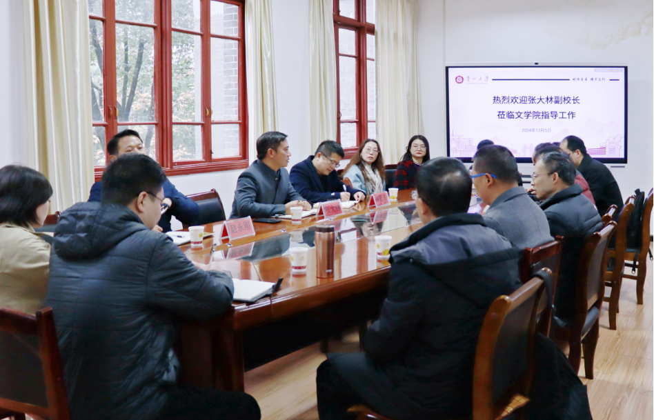 2024年12月5日下午,贵州大学党委常委、副校长张大林到文学院调研座谈。文学院党委书记陈爱东、副书记副院长赵永刚、副处级组织员周贤军出席,教师代表10余人参与座谈交流。