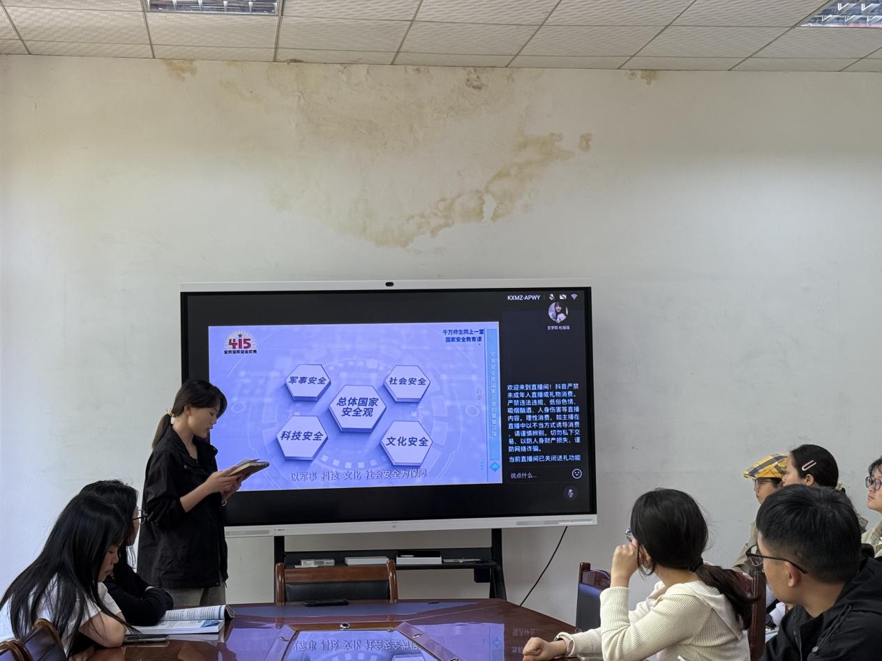 为践行总体国家安全观,筑牢青年思想防线,深化青年学子对国家安全内涵的理解,推动国家安全教育融入日常学习与生活。我院于2025415日下午15时在人文楼204会议室展开全民国家安全教育线下集中观看活动。研究生会主席陈蝶主持活动,全体研究生共同参与学习。