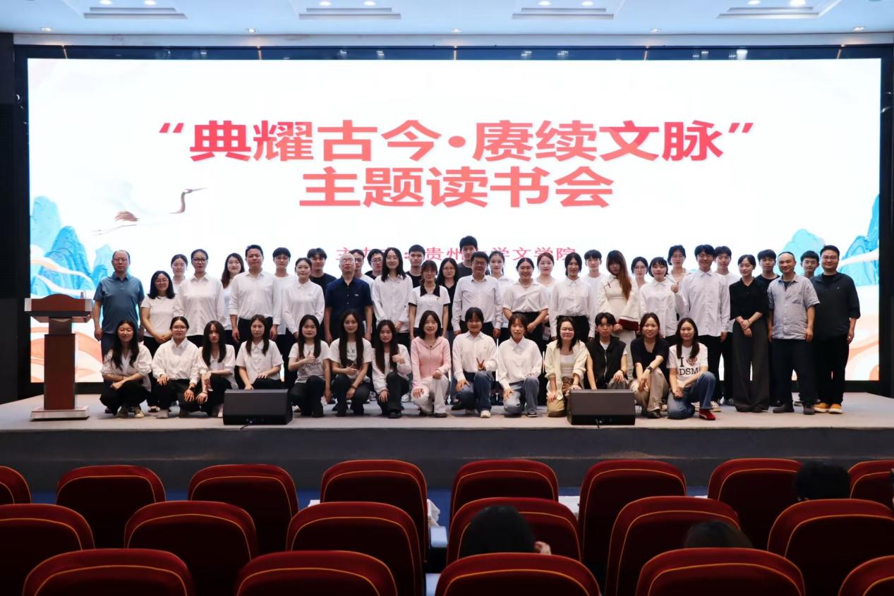 2025年5月20日下午,贵州大学文学院在东校区行政楼报告厅开展以“典耀古今·赓续文脉——新时代青年的文化传承与使命担当”为主题的读书会活动。文学院党委书记陈爱东、院长谭德兴、副书记副院长赵永刚、副处级组织员周贤军出席活动,郭付利、肖玉婷、曹家鹏等几位老师以及学院2022级、2023级全体本科生参加活动。活动由2302班的张伊婷、吴攸玥同学主持。