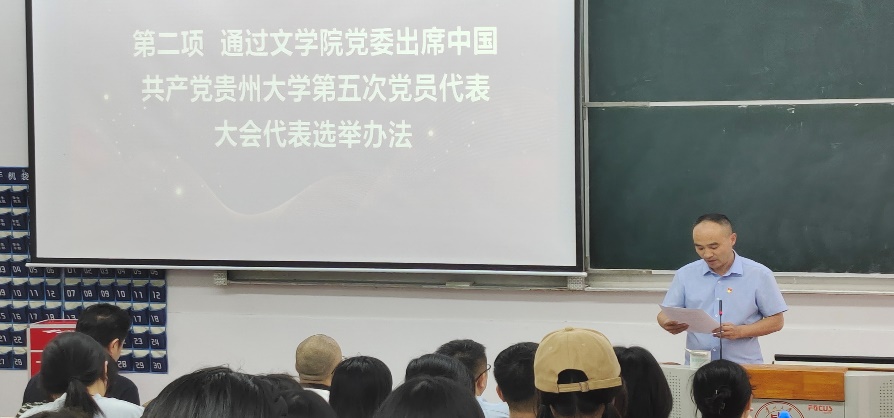 副处级组织员周贤军宣读《文学院党委出席中国共产党贵州大学第五次党员代表大会代表选举办法》。经审议,全体党员举手表决,一致同意通过选举办法。