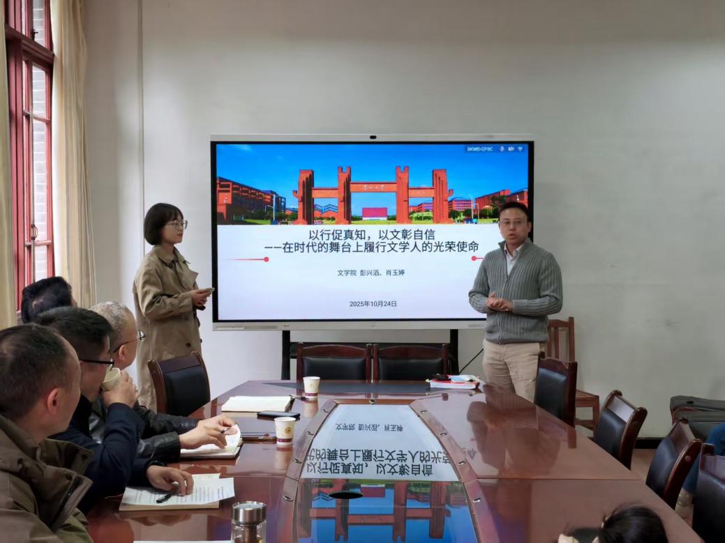 为深入学习贯彻习近平新时代中国特色社会主义思想,推动文化育人、实践育人走深走实。2025年10月24日中午,文学院举办“以行促真知,以文彰自信——在时代的舞台上履行文学人的光荣使命”理论宣传二人讲活动。本次活动由教工党支部书记彭兴滔、党政办公室副主任肖玉婷两位老师主讲,围绕新时代文学人的使命担当,系统阐述了文学院在人才培养、文化传承与服务社会方面的探索与实践。
