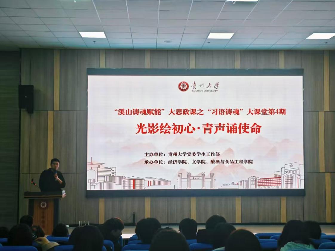 11月27日19:00,“溪山铸魂赋能”大思政课之“习语铸魂”大课堂第4期“光影绘初心·青声诵使命”活动在崇德楼104举行。本次活动由校学生工作处主办,经济学院、文学院及酿酒与食品工程学院共同承办。贵州大学学生处副处长崔永霞、经济学院院党委副书记向秋丹、酿酒与食品工程学院党委副书记张丽华出席活动,经济学院辅导员蒋信炜老师主持活动。