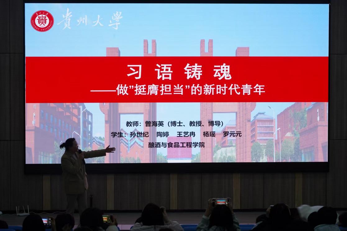 酿酒与食品工程学院的曾海英教授和学生代表作题为“使命传承· 行业青年‘讲’述担当”的宣讲。宣讲中,曾海英结合自身丰富的科研与教学经验,以及酿酒与食品工程行业的实际发展,讲述了不同年代青年在该领域中的奋斗故事与使命担当。她强调,一代又一代的青年用智慧和汗水推动着国家的发展与进步,展现了每一代青年在时代浪潮中挺膺担当的精神风貌。