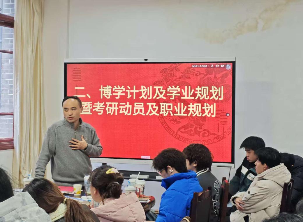 会上,周贤军紧扣“博学计划”开展考研动员与职业规划指导,他鼓励积极准备考研,充分用好寒假时间,认真学习,为高质量就业提前谋划、早做准备。他还提前通过问卷调查收集同学们的考研意向,并将整理打印装订成册的考研资料,发放给36名有考研需求的同学。