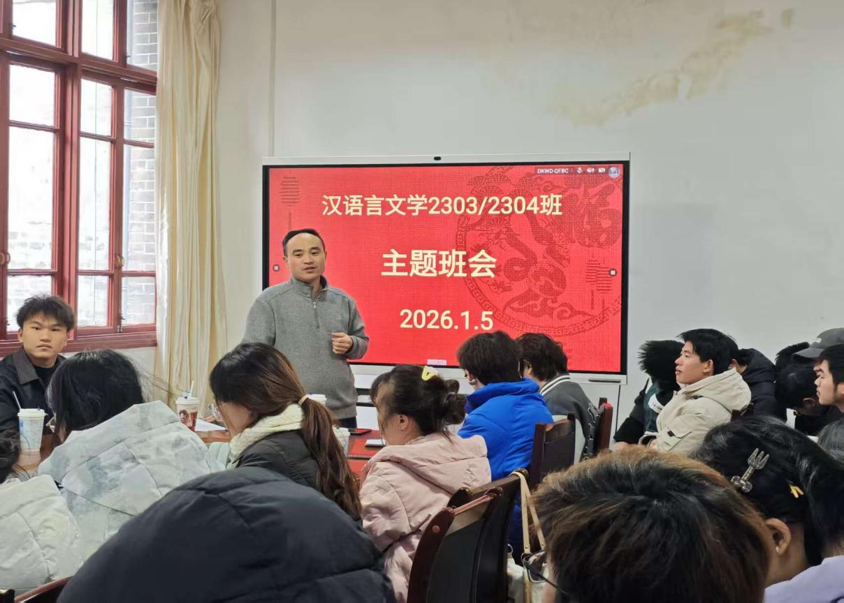 2026年1月5日下午,为切实强化学生寒假安全防范意识,帮助同学们明确学业规划,人文学院汉语2303班与2304班于人文楼204教室联合召开期末安全教育暨考研动员主题班会。班主任周贤军老师主持会议,两班80余名同学参会。
